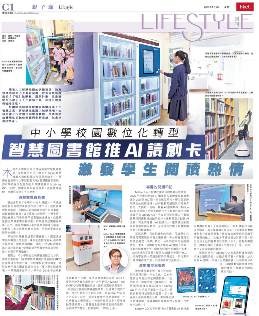 Million Tech 智慧校園項目總監葉詠恩預測,2026 年全港採用 RFID 圖書館方案的學校有機會達到 300 至 450 間。但在數位時代,學生面對琳瑯滿目的娛樂選擇,如何推動閱讀風氣才是教育界的一大挑戰。她稱,藉着 AI 應用熱潮,Million Tech 亦推出了全港首個結合人工智慧技術的校園閱讀平台 Library GO,平台除可整合個人化書籍推薦與閱讀數據追蹤功能外,最新更引入創意 AI 元素,可生成專屬「AI創讀卡」,讓閱讀活動變得更富趣味與互動性,全面提升校園「智慧閱讀生態」的體驗層次。